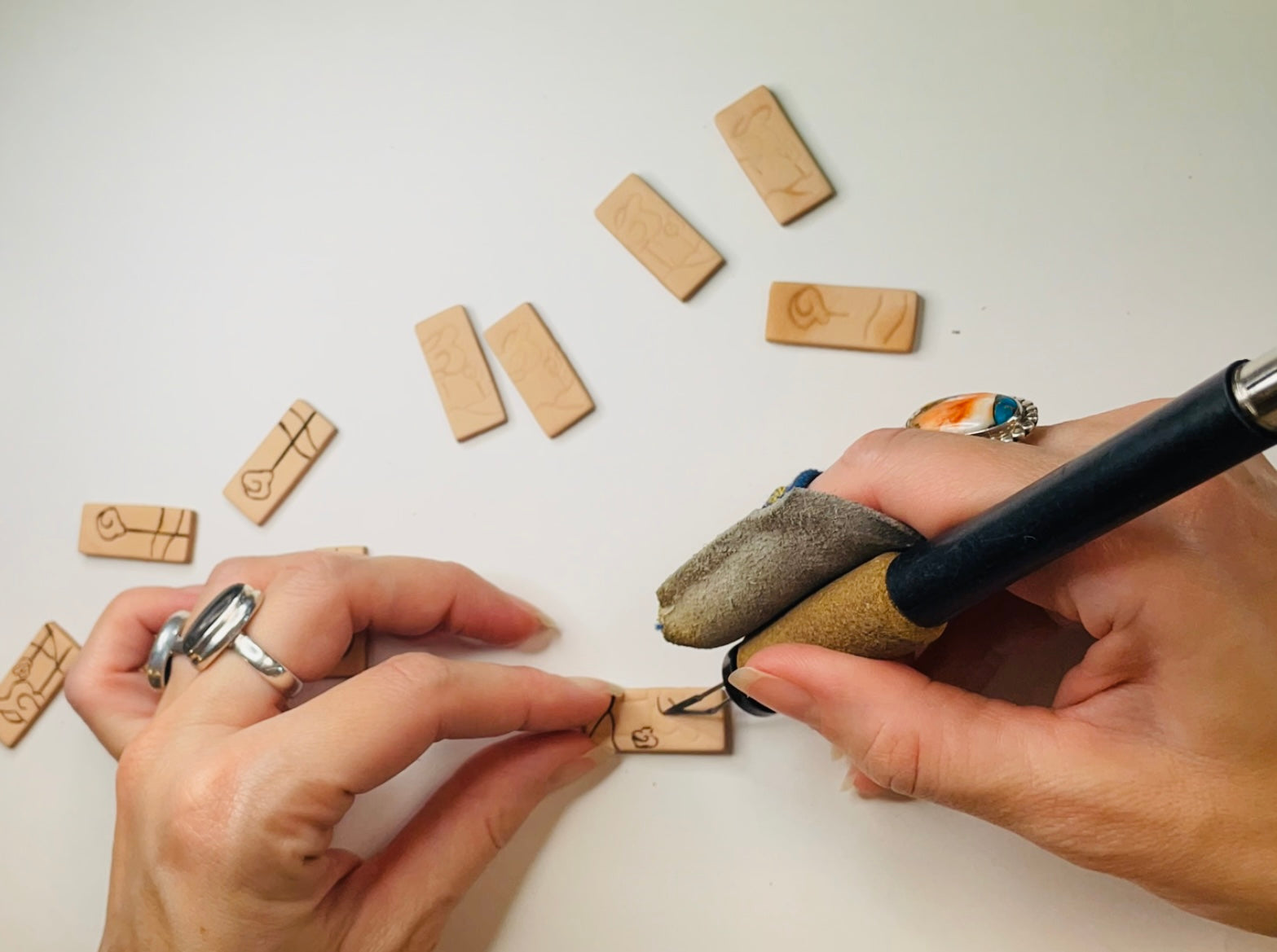 Wood burning was the beginning of this venture. When working with wood, each piece is so unique due to the small natural knots in wood. The unpredictable way wood reacts to the burner creating natural small differences in each piece.