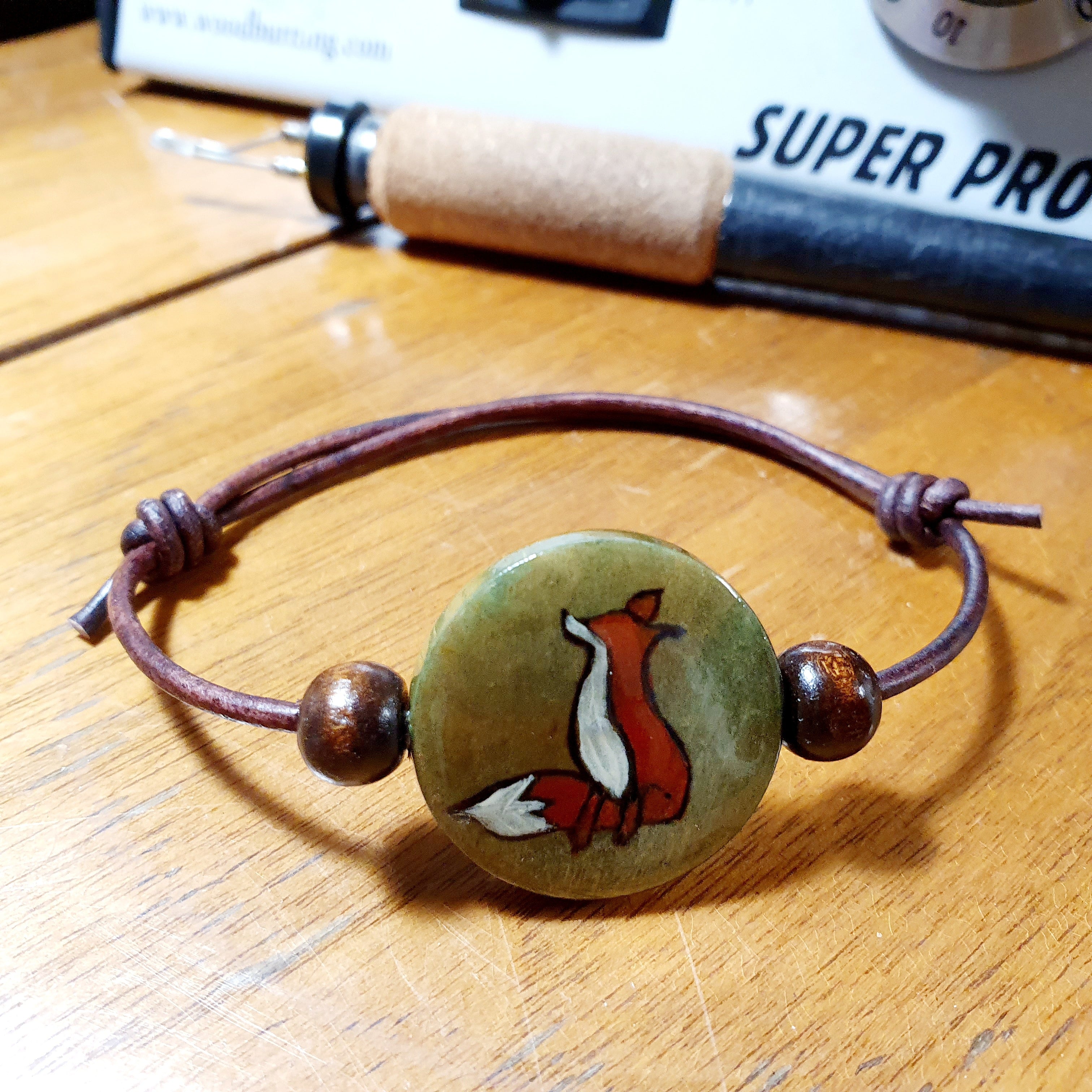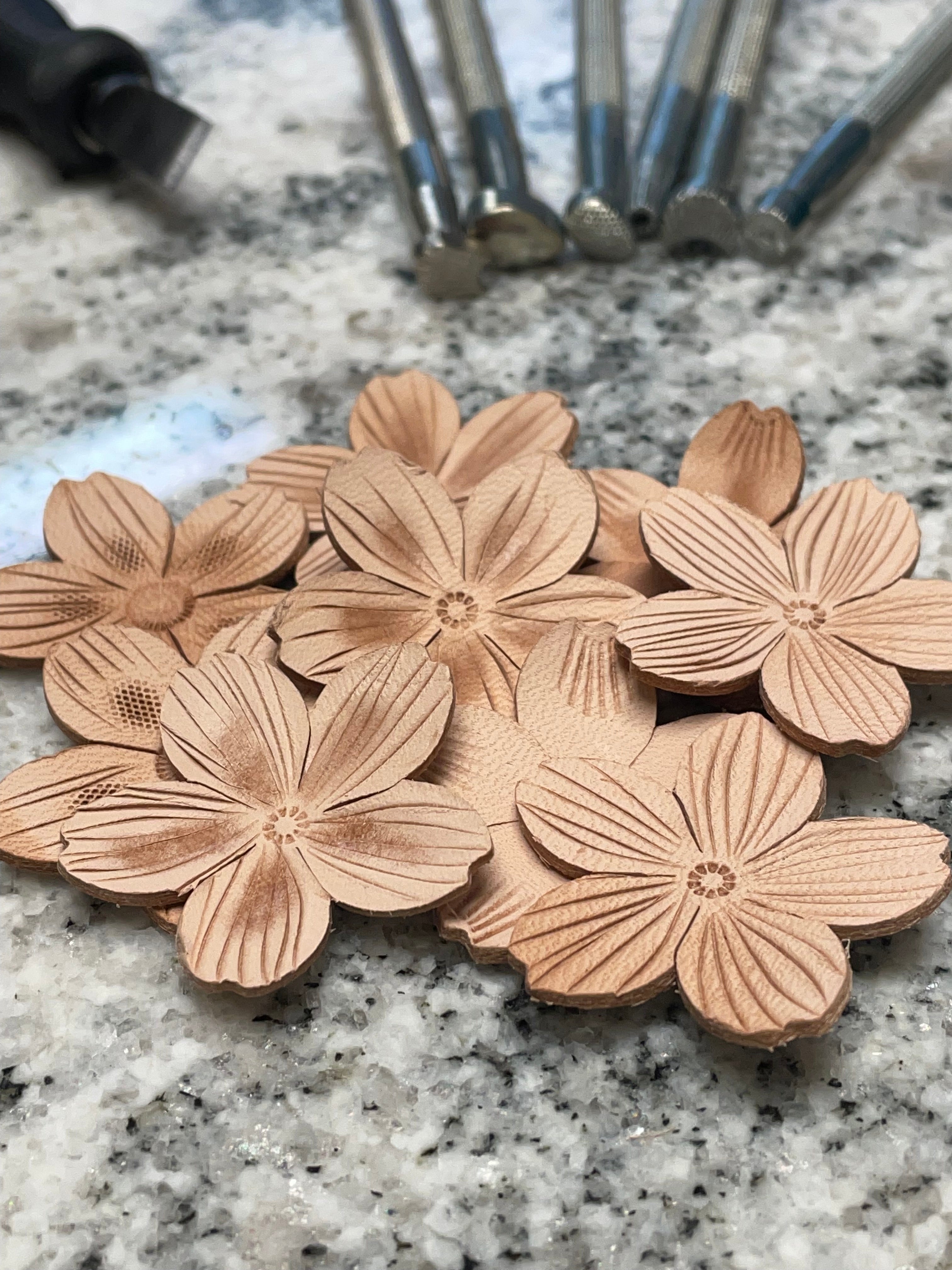 Genuine leather is a fav medium. We love burning it, embossing it, tooling and cutting out fun shapes! Every piece is unique due to the natural element of leather and the hand made touch of the artist.