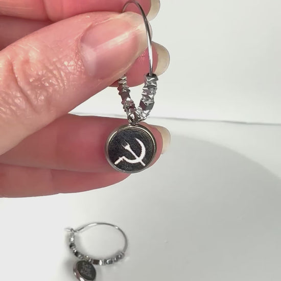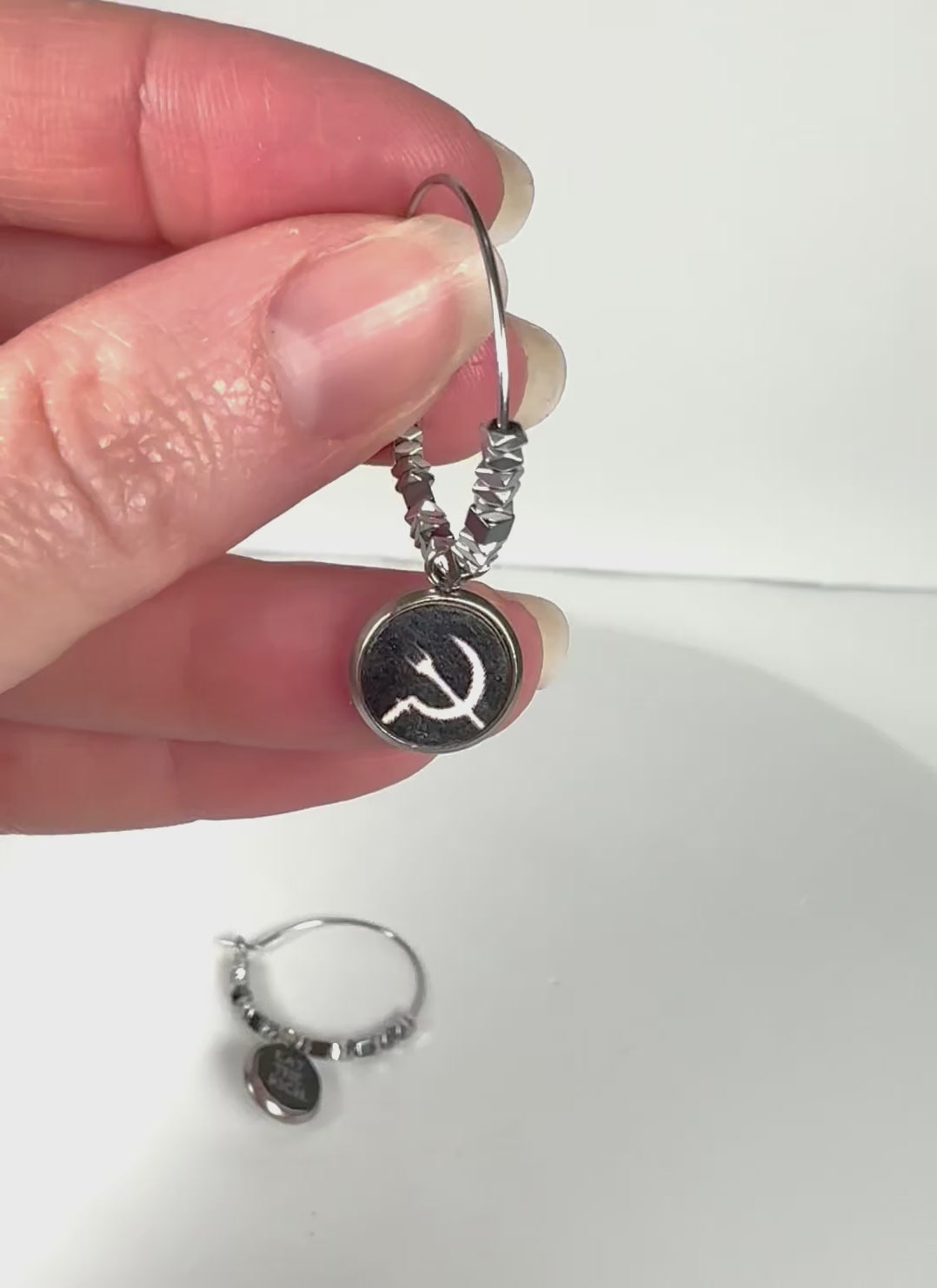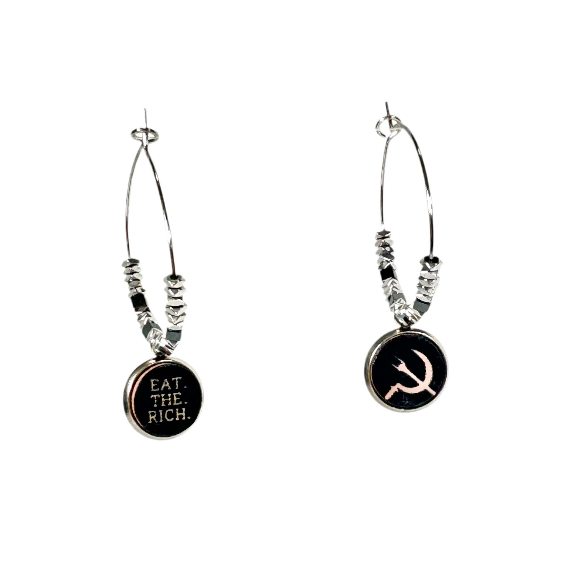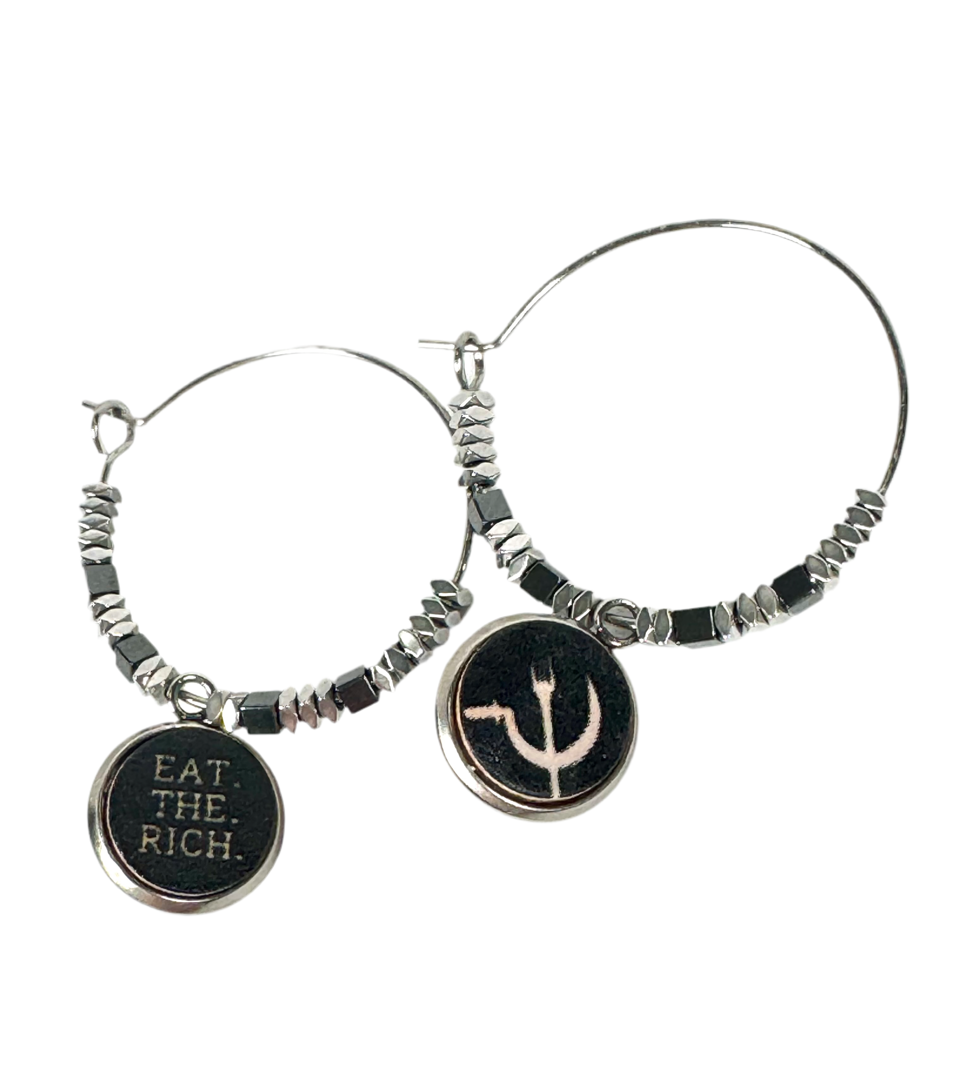 The EAT.THE.RICH. is written in size 14 font. Big enough to read yet small enough to whisper and not yell. The other earring is embellished with the symbol representing the eat the rich phrase that has the historical meaning from the French Revolution.
