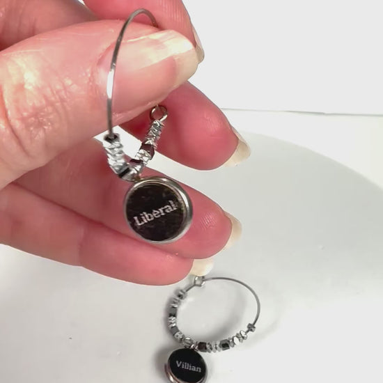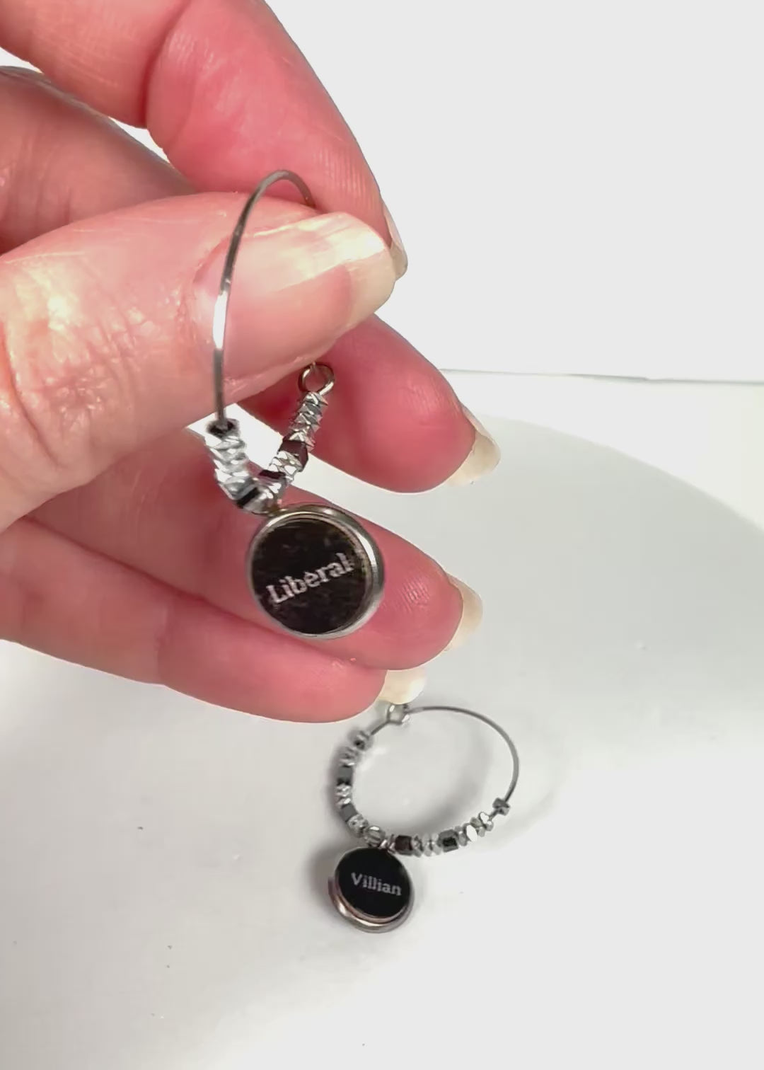 This is a handmade item. The writing and image was created then transferred onto leather and placed into the bezel to create these one of a kind earrings.